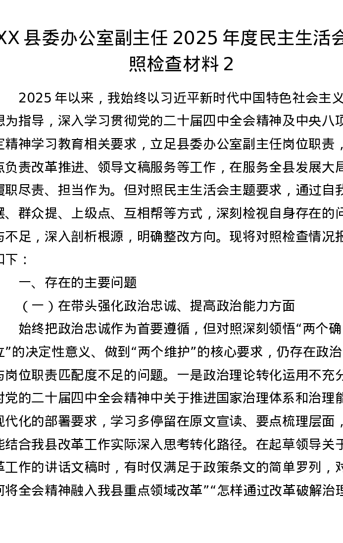 XX县委办公室副主任2025年度xxxxx对照检查材料2