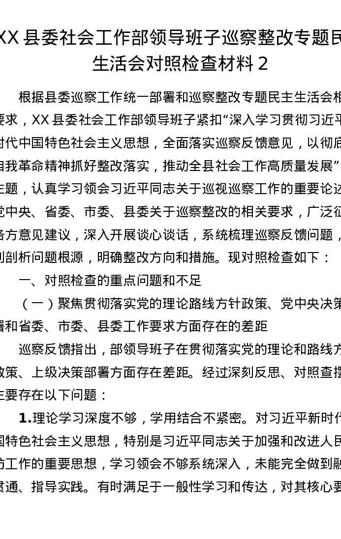 XX县委社会工作部领导班子巡察整改专题xxxxx对照检查材料2
