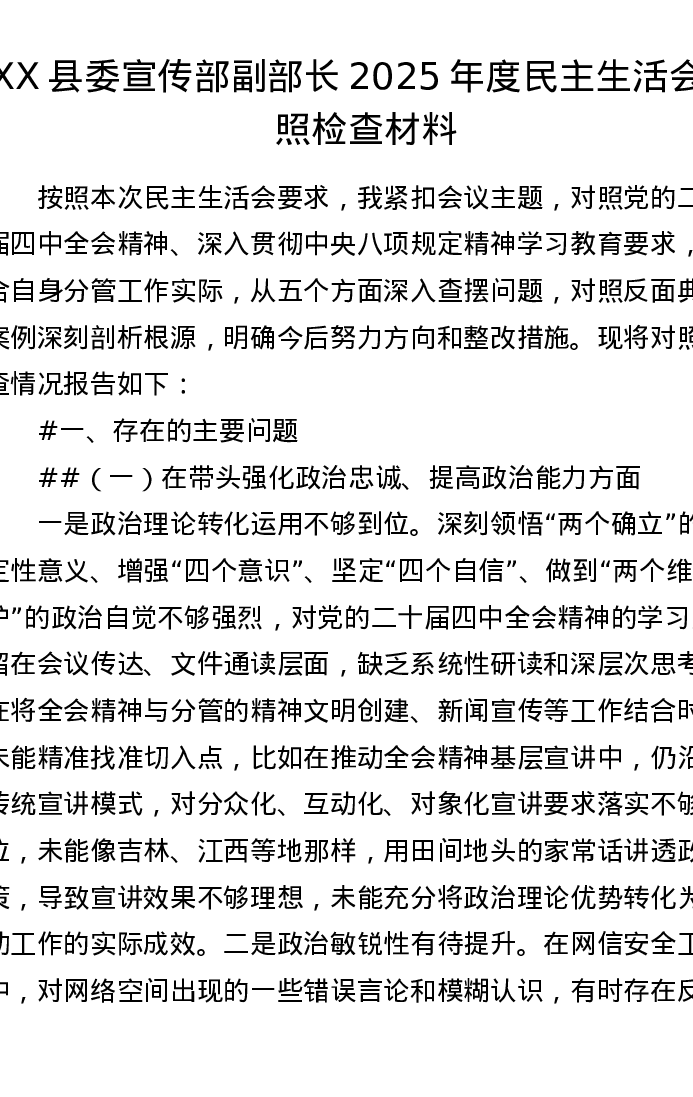 XX县委宣传部副部长2025年度xxxxx对照检查材料(6523字)