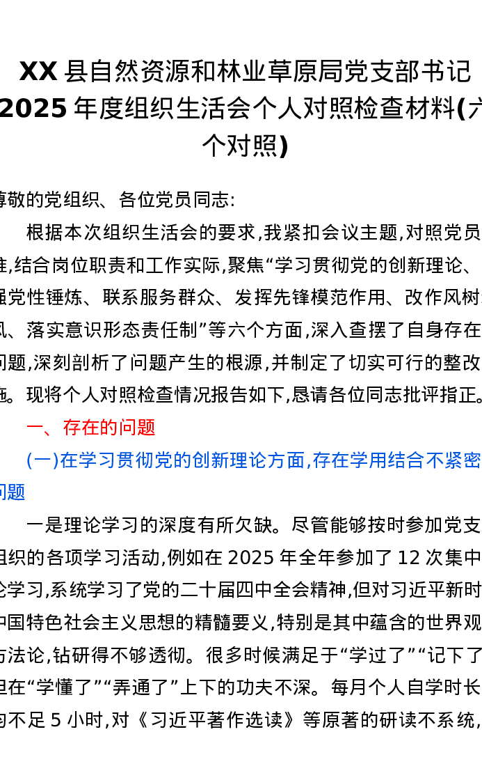 XX县自然资源和林业草原局党支部书记2025年度组织xxx个人对照检查材料(六个对照)