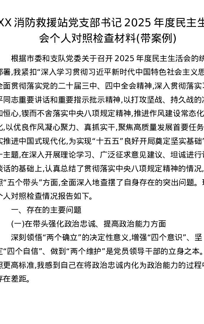 XX消防救援站党支部书记2025年度xxxxx个人对照检查材料(带案例)