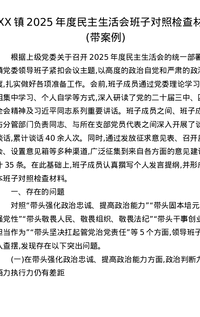 XX镇2025年度xxxxx班子对照检查材料(带案例)