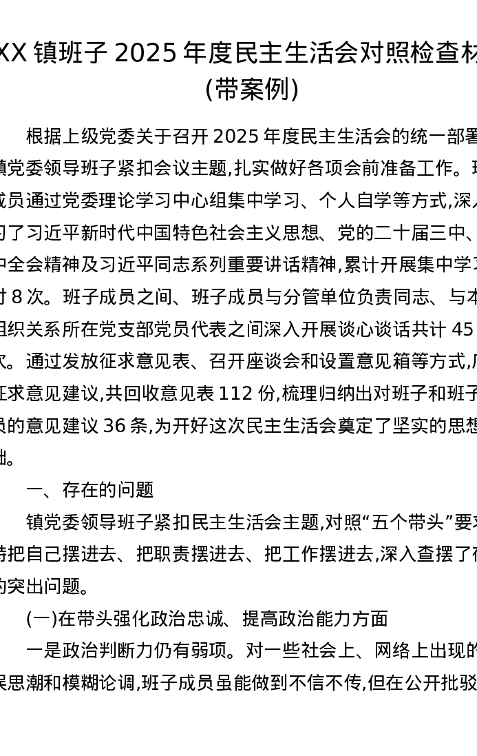 XX镇班子2025年度xxxxx对照检查材料(带案例)