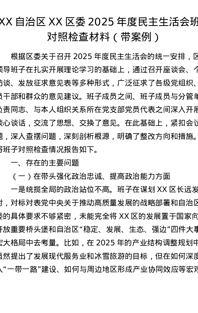 XX自治区XX区委2025年度xxxxx班子对照检查材料(带案例)