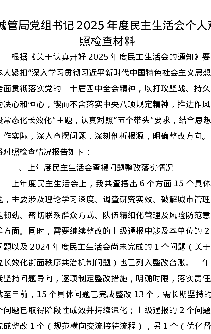 城管局党组书记2025年度xxxxx个人对照检查材料