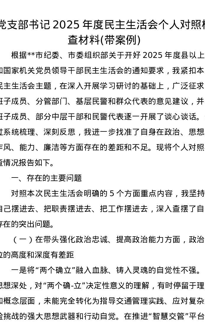 党支部书记2025年度xxxxx个人对照检查材料(带案例)