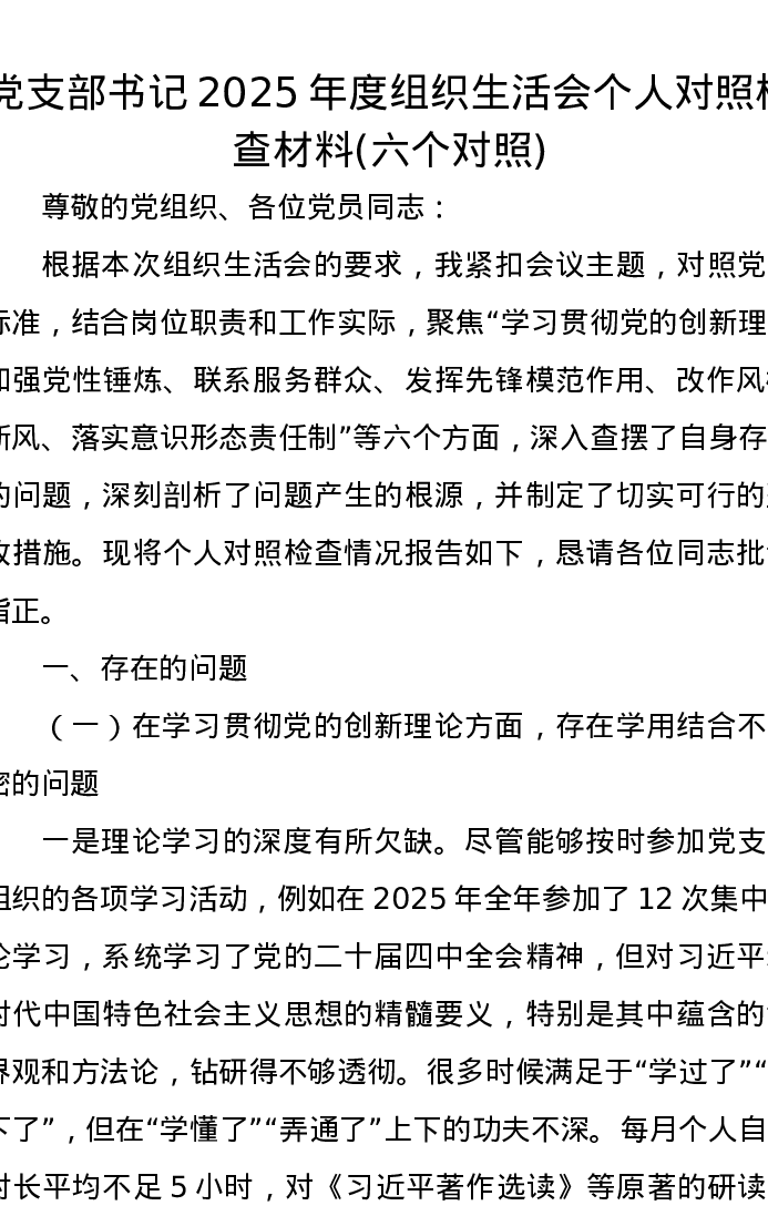 党支部书记2025年度组织xxx个人对照检查材料(六个对照)