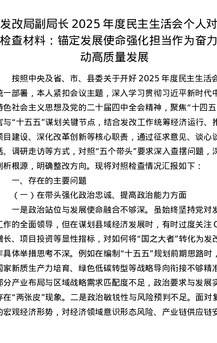 发改局副局长2025年度xxxxx个人对照检查材料:锚定发展使命 强化担当作为 奋力推动高质量发展