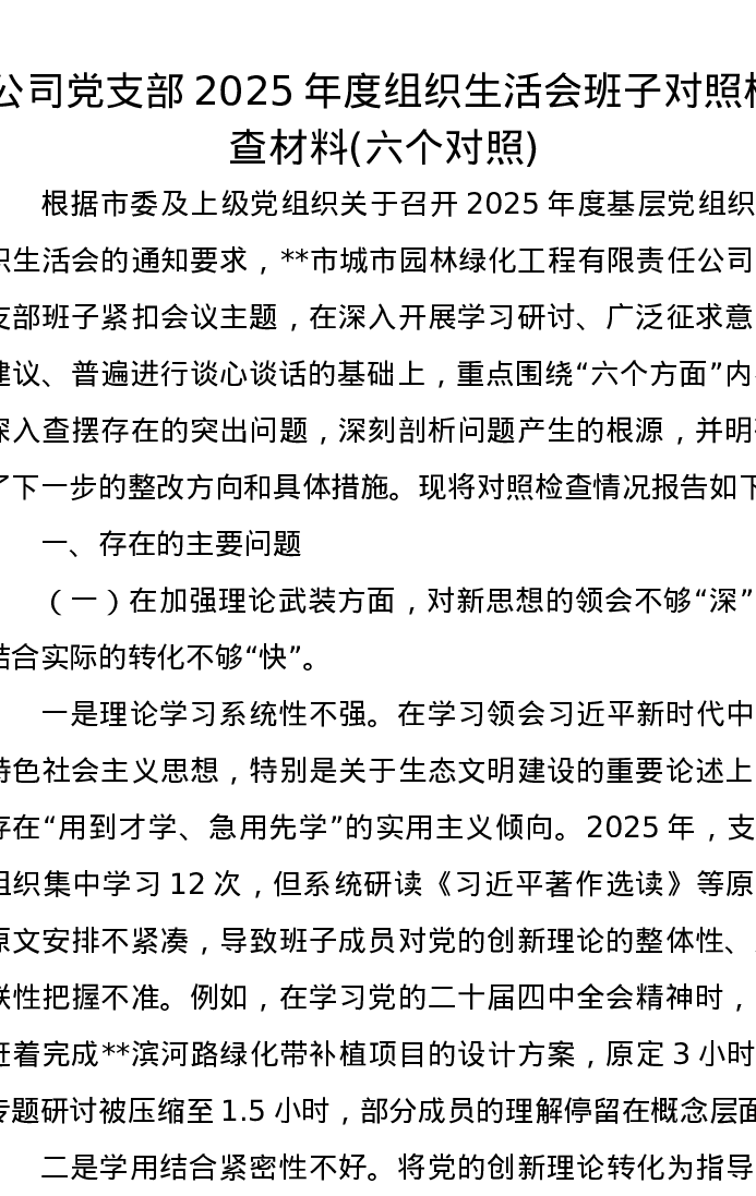公司党支部2025年度组织xxx班子对照检查材料(六个对照)