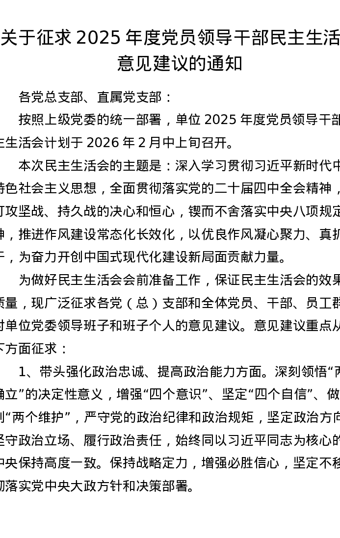 关于征求2025年度党员领导干部xxxxx意见建议的通知