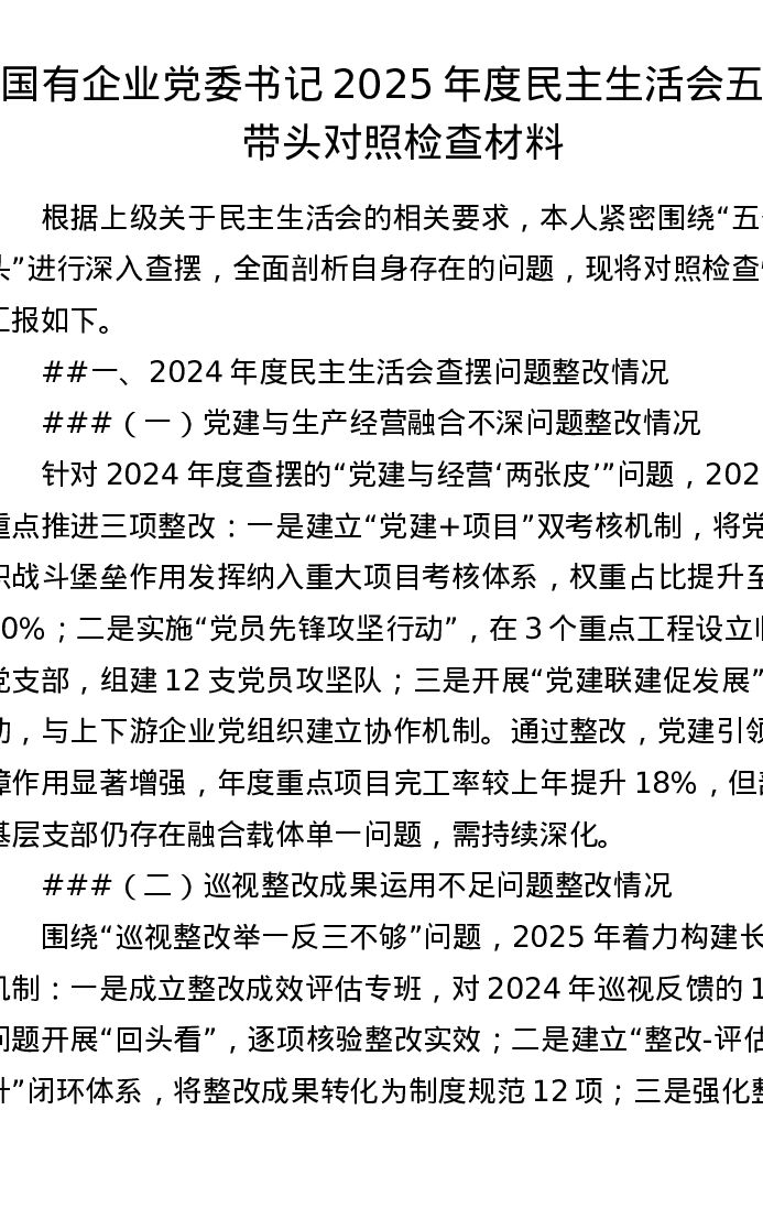 国有企业党委书记2025年度xxxxx五个带头对照检查材料(7700字)