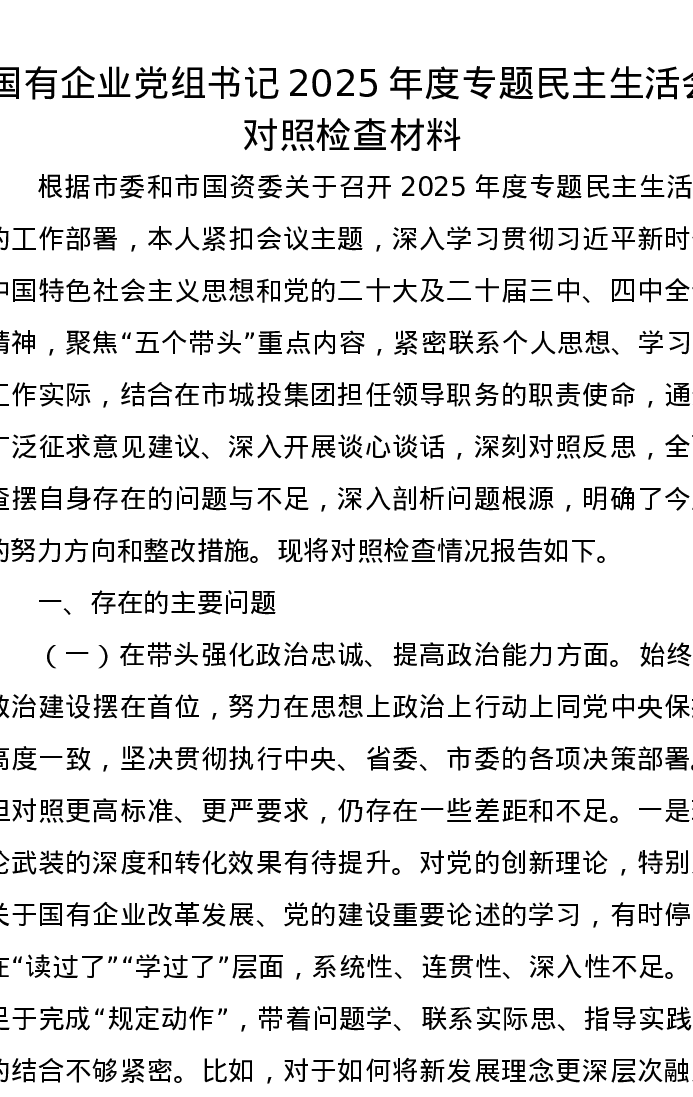 国有企业党组书记2025年度专题xxxxx对照检查材料