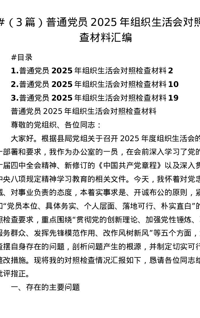 汇编:普通党员2025年组织xxx对照检查材料3篇