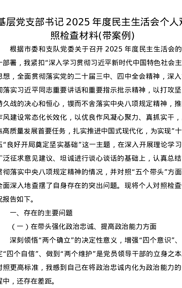 基层党支部书记2025年度xxxxx个人对照检查材料(带案例)