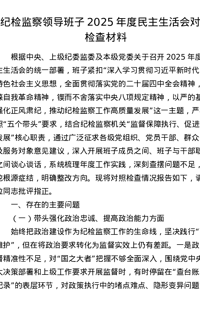纪检监察领导班子2025年度xxxxx对照检查材料