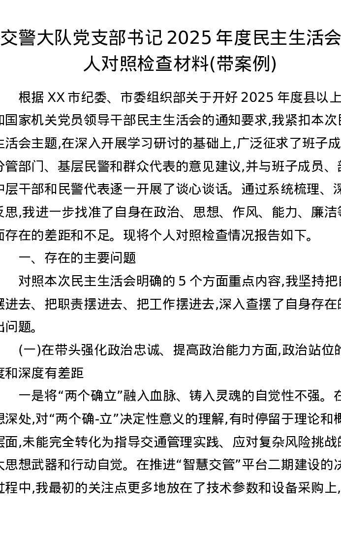 交警大队党支部书记2025年度xxxxx个人对照检查材料(带案例)