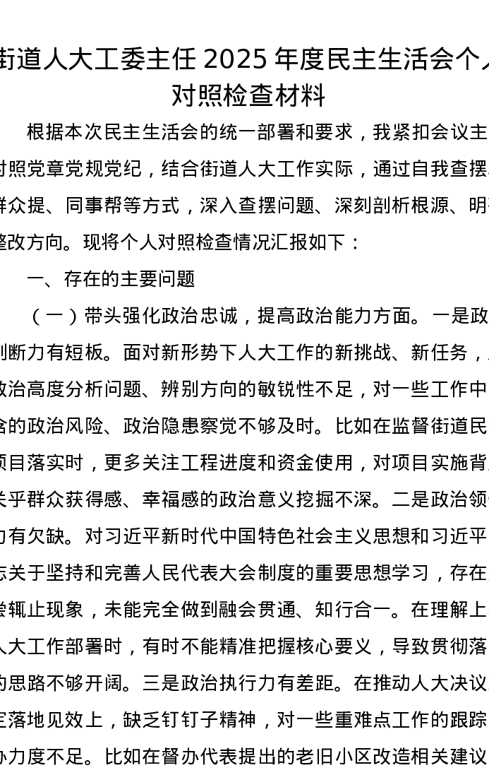 街道人大工委主任2025年度xxxxx个人对照检查材料