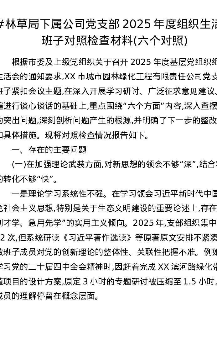 林草局下属公司党支部2025年度组织xxx班子对照检查材料(六个对照)