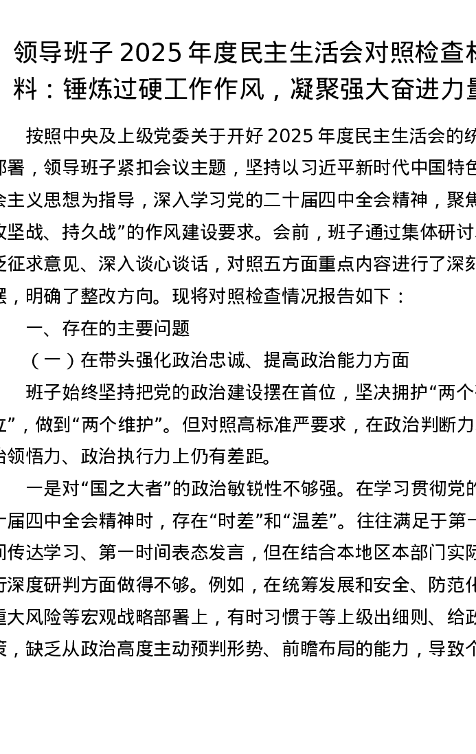 领导班子2025年度xxxxx对照检查材料:锤炼过硬工作作风,凝聚强大奋进力量