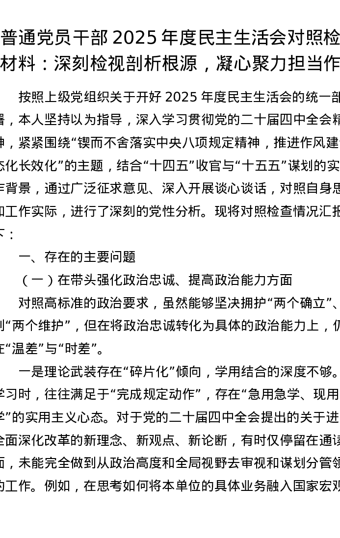 普通党员干部2025年度xxxxx对照检查材料:深刻检视剖析根源,凝心聚力担当作为