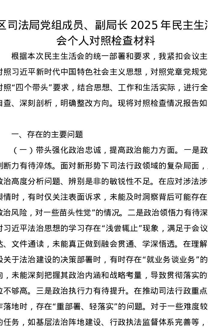 区司法局党组成员、副局长2025年xxxxx个人对照检查材料