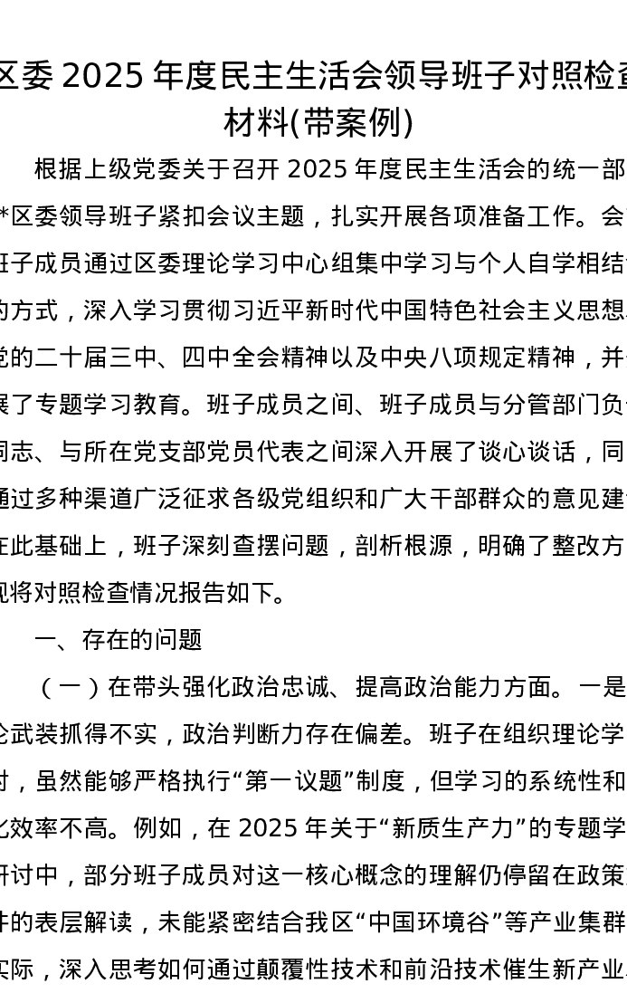 区委2025年度xxxxx领导班子对照检查材料(带案例)