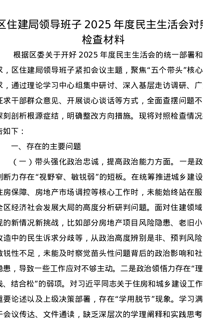 区住建局领导班子2025年度xxxxx对照检查材料