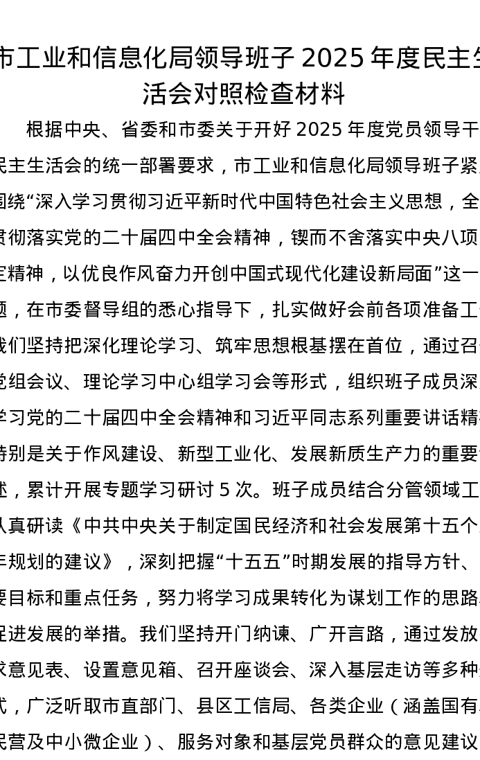市工业和信息化局领导班子2025年度xxxxx对照检查材料