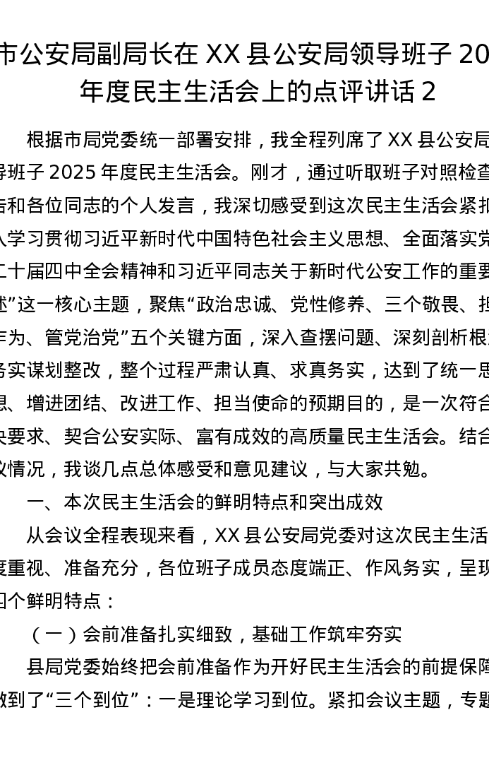 市公安局副局长在XX县公安局领导班子2025年度xxxxx上的点评讲话2