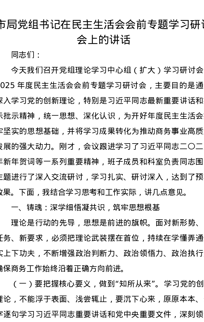 市局党组书记在xxxxx会前专题学习研讨会上的讲话