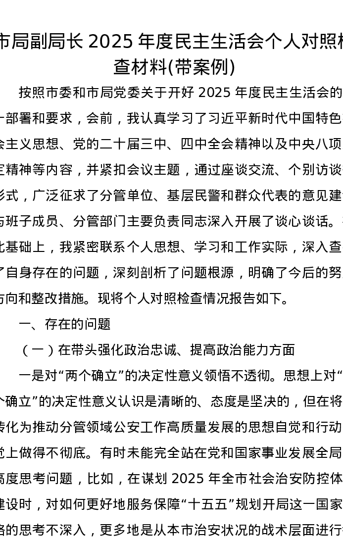 市局副局长2025年度xxxxx个人对照检查材料(带案例)