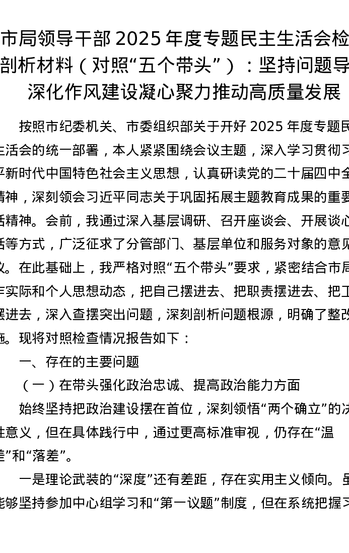 市局领导干部2025年度专题xxxxx检视剖析材料(对照五个带头):坚持问题导向深化作风建设 凝心聚力推动高质量发展