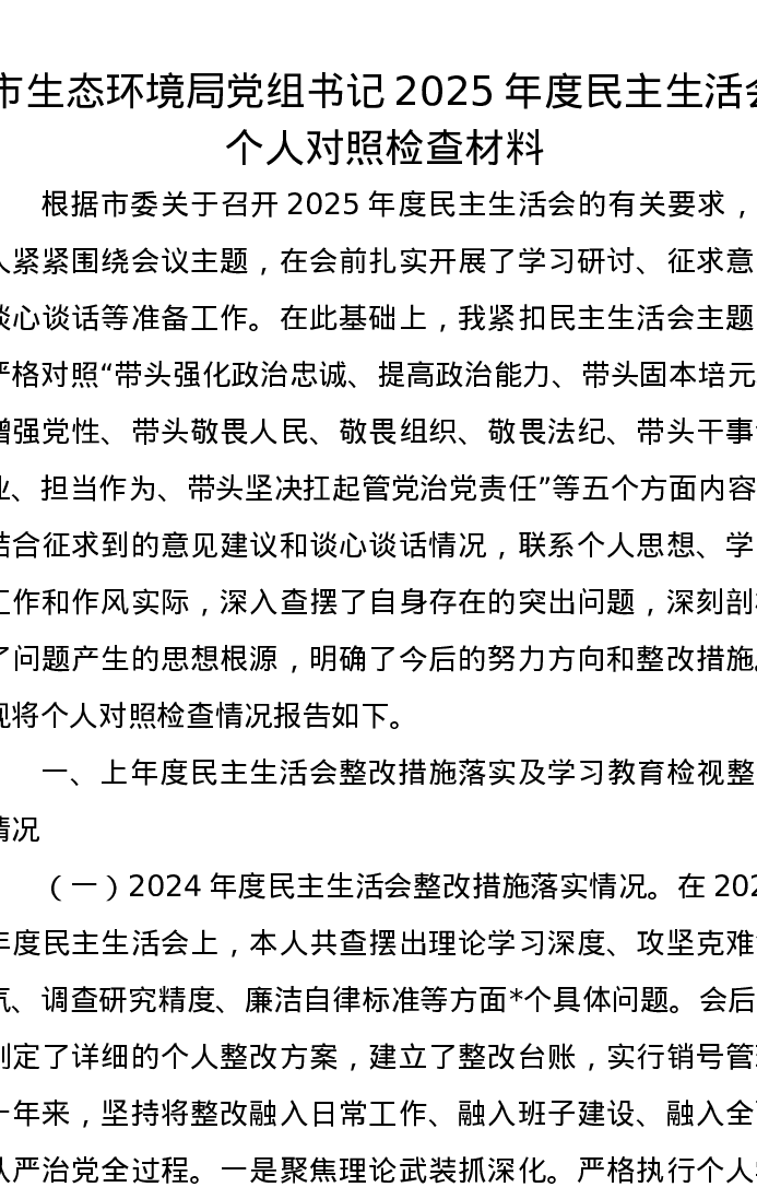 市生态环境局党组书记2025年度xxxxx个人对照检查材料