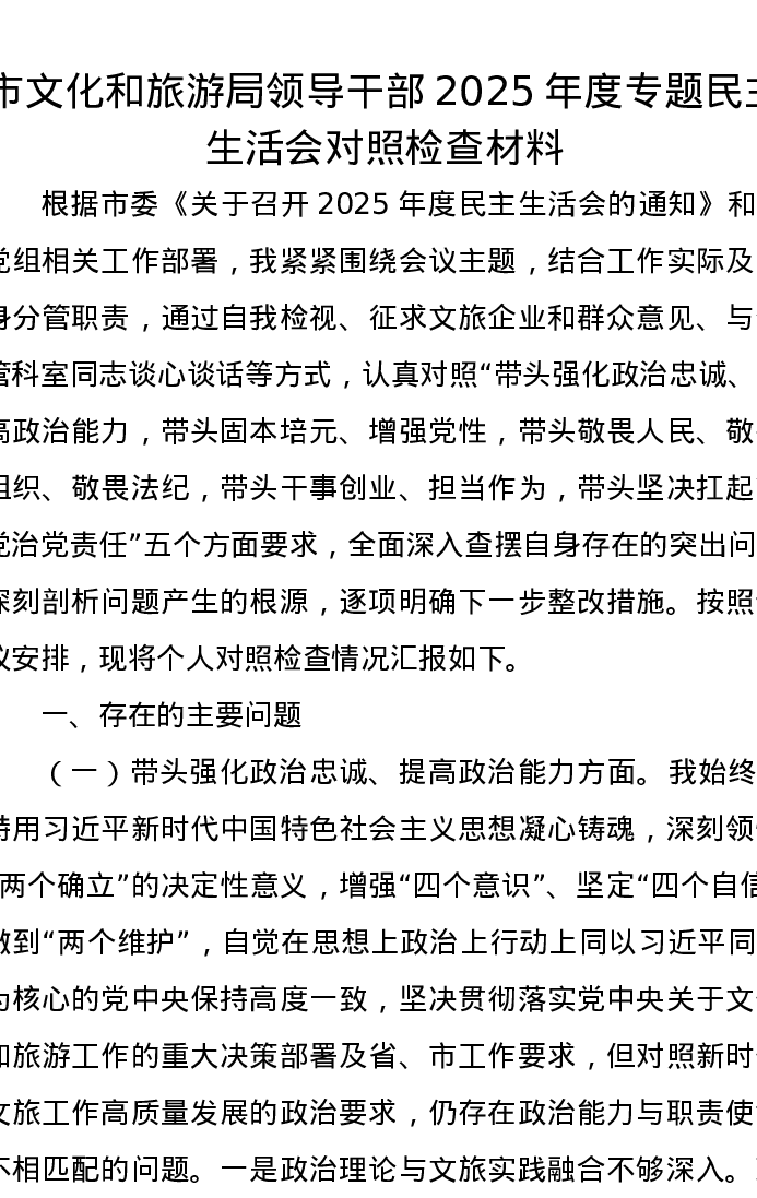 市文化和旅游局领导干部2025年度专题xxxxx对照检查材料
