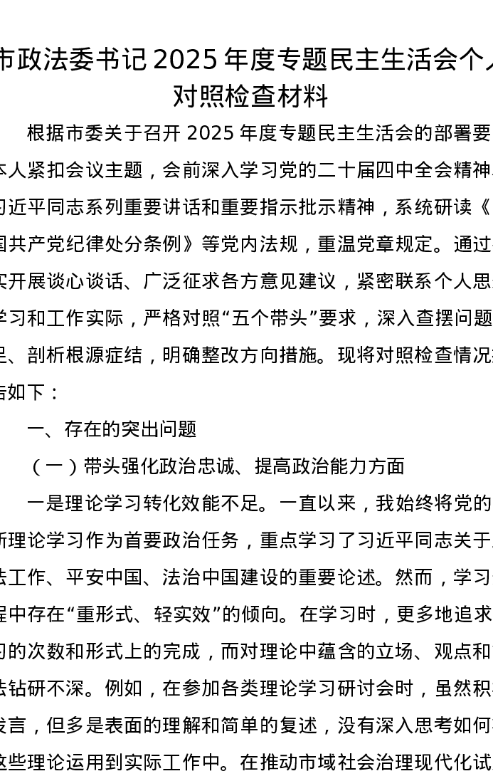 市政法委书记2025年度专题xxxxx个人对照检查材料