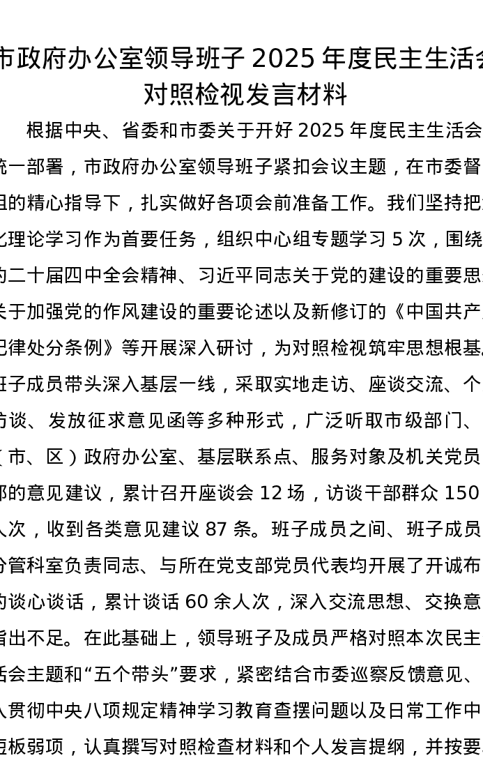 市政府办公室领导班子2025年度xxxxx对照检视发言材料