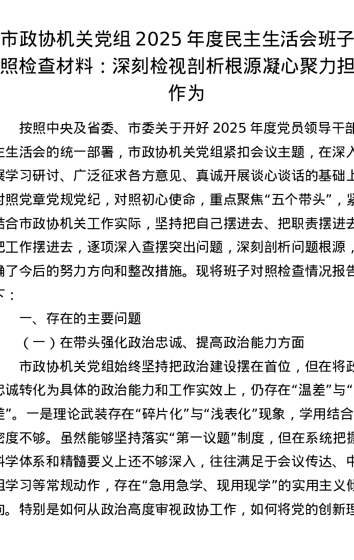 市政协机关党组2025年度xxxxx班子对照检查材料:深刻检视剖析根源 凝心聚力担当作为