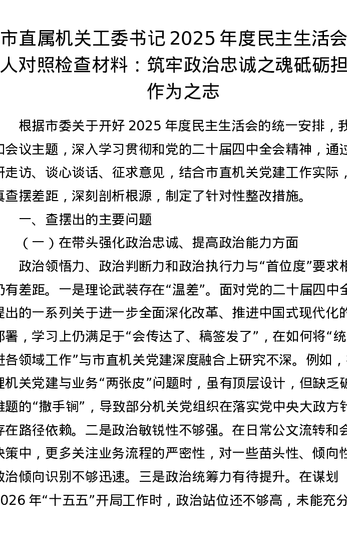 市直属机关工委书记2025年度xxxxx个人对照检查材料:筑牢政治忠诚之魂 砥砺担当作为之志