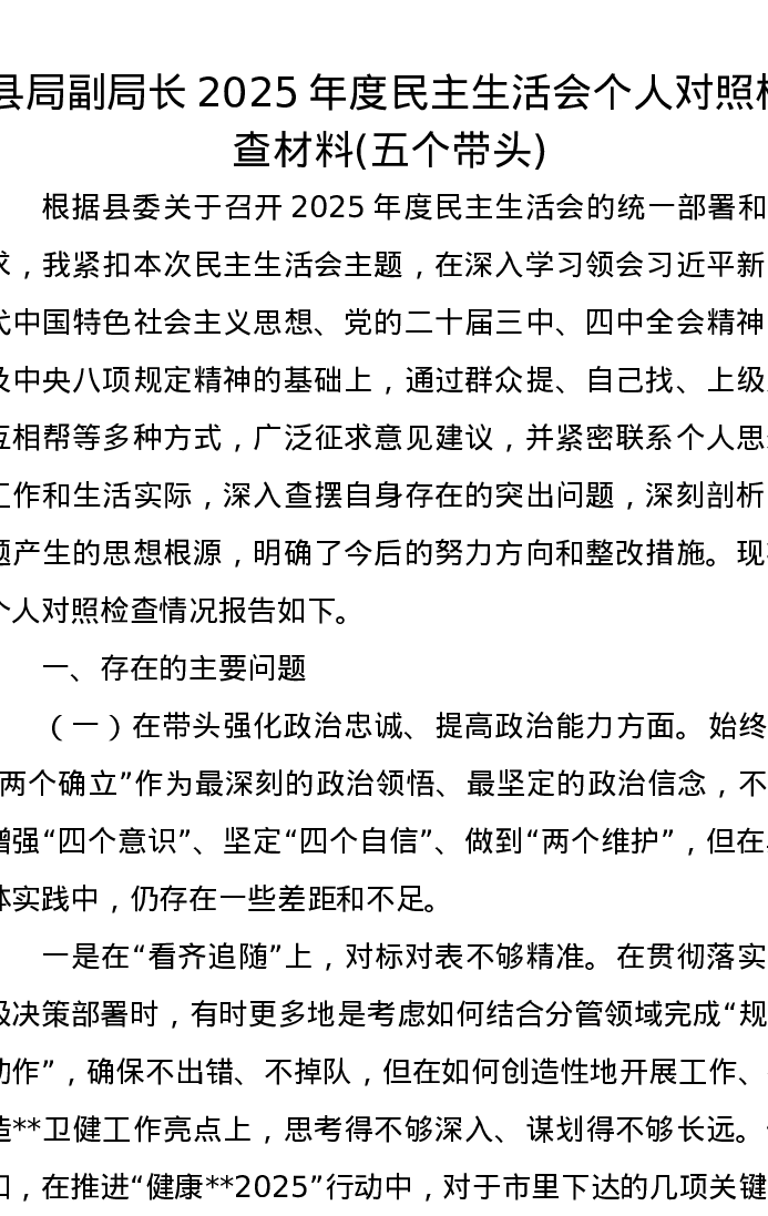 县局副局长2025年度xxxxx个人对照检查材料(五个带头)