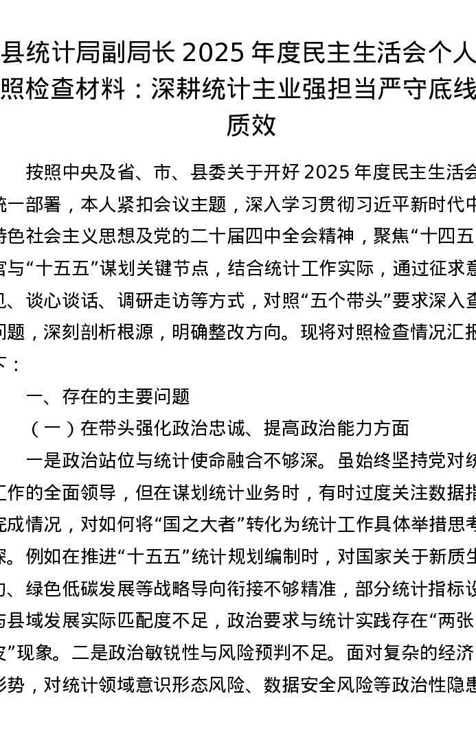 县统计局副局长2025年度xxxxx个人对照检查材料:深耕统计主业强担当 严守底线提质效