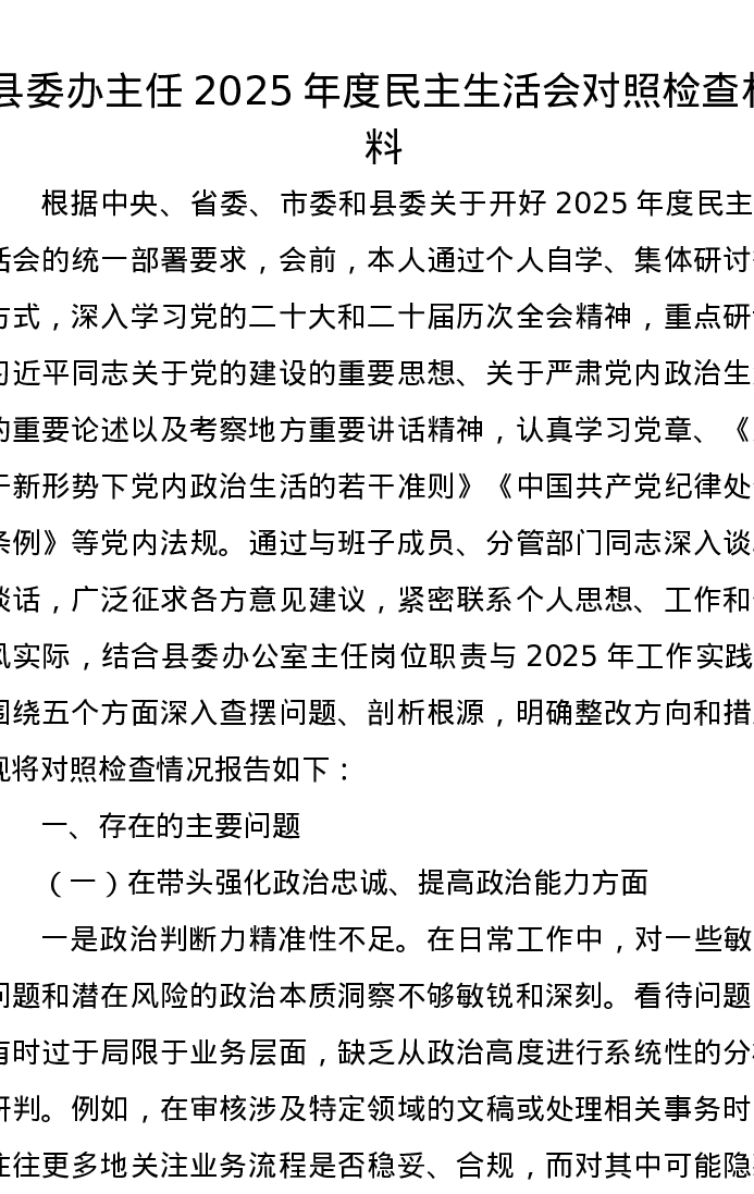 县委办主任2025年度xxxxx对照检查材料