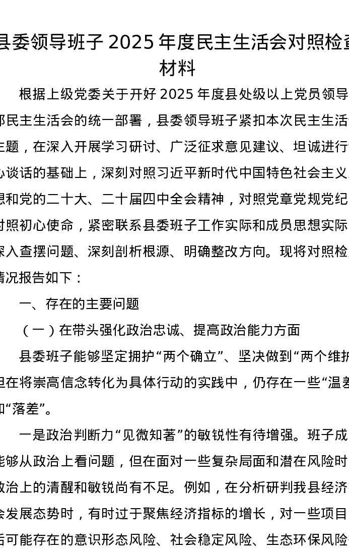 县委领导班子2025年度xxxxx对照检查材料