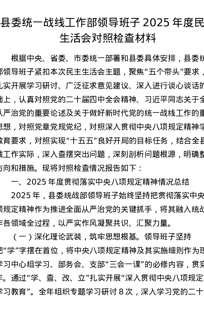 县委统一战线工作部领导班子2025年度xxxxx对照检查材料