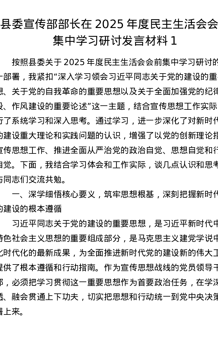 县委宣传部部长在2025年度xxxxx会前集中学习研讨发言材料1