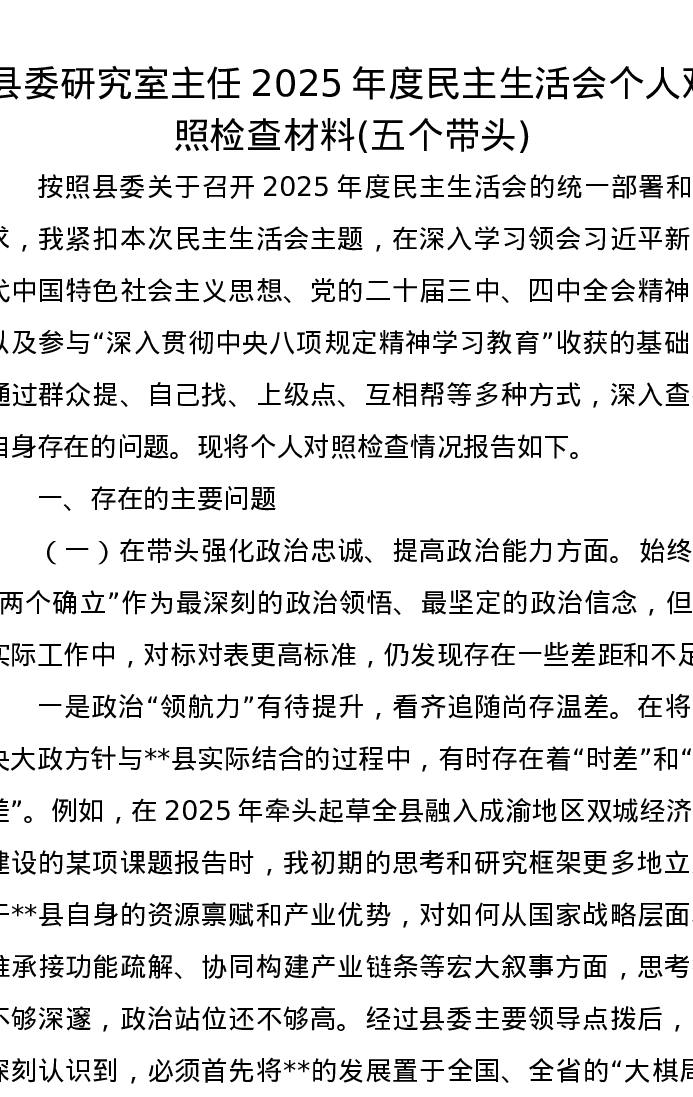 县委研究室主任2025年度xxxxx个人对照检查材料(五个带头)