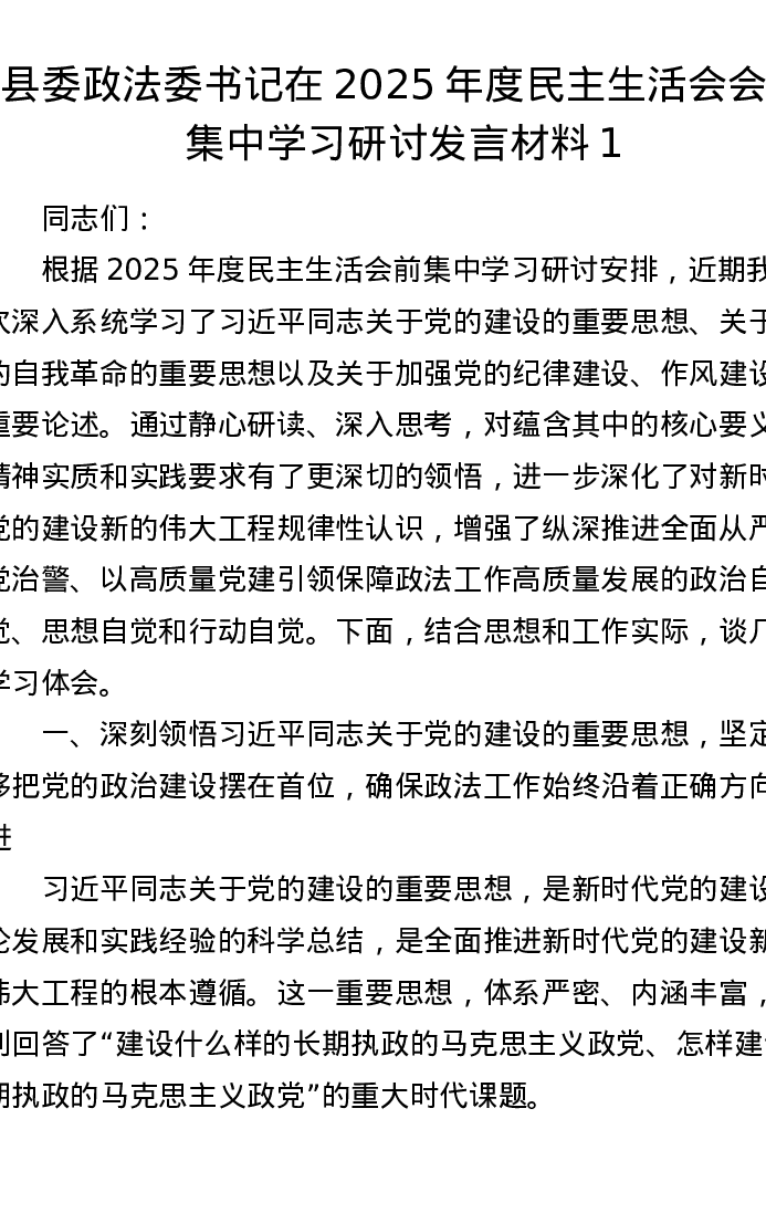 县委政法委书记在2025年度xxxxx会前集中学习研讨发言材料1