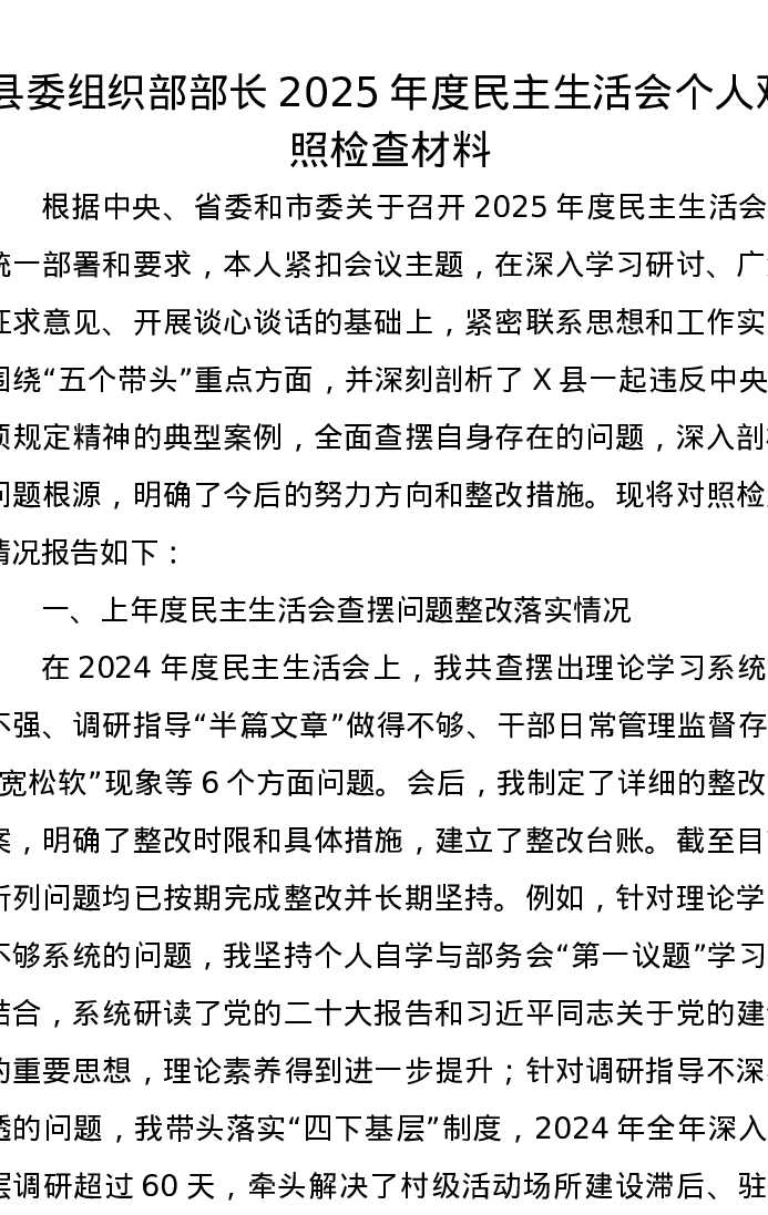 县委组织部部长2025年度xxxxx个人对照检查材料