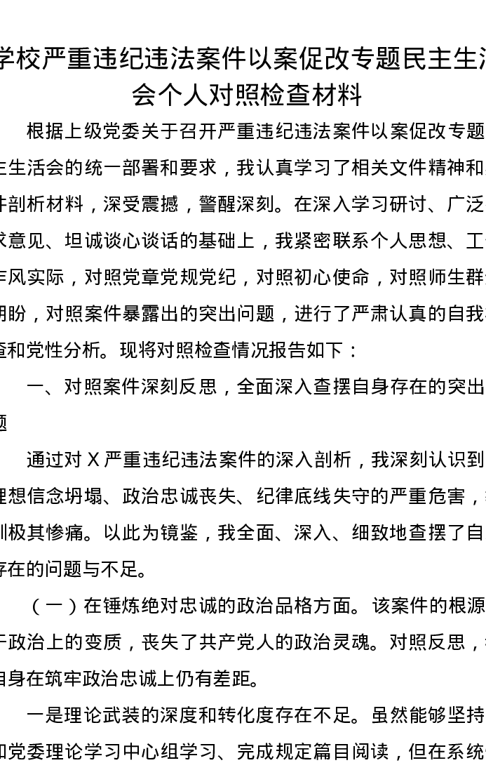 学校严重违纪违法案件以案促改专题xxxxx个人对照检查材料