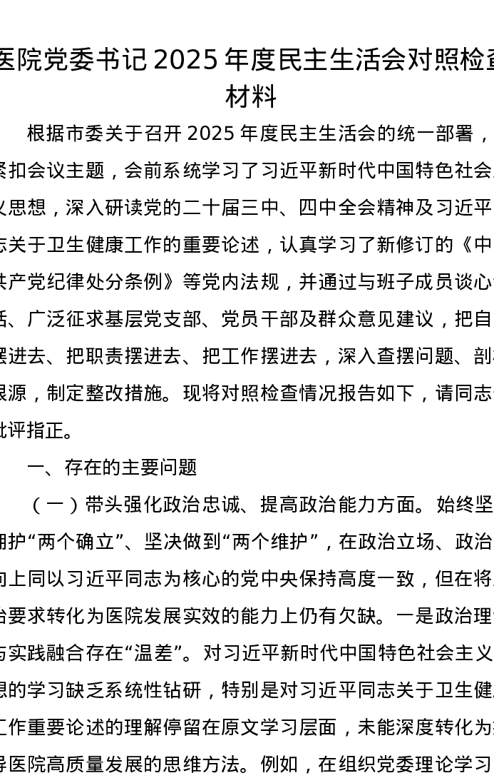 医院党委书记2025年度xxxxx对照检查材料