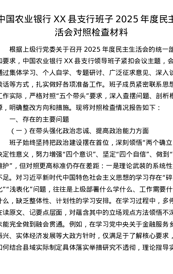 银行XX县支行班子2025年度xxxxx对照检查材料(6809字)